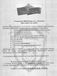 Предлагаем Вам рассмотреть вакансии Управления МВД России по г. Тольятти для граждан РФ в возрасте от 18 до 40 лет, годных по состоянию здоровья, имеющих образование не ниже среднего (полного) на должности: