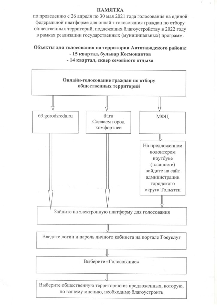 Предоставляем памятку по проведению с 26 апреля по 30 мая 2021 года о голосовании на единой федеральной платформе для онлайн-голосования граждан по отбору общественных территорий, подлежащих благоустройству в 2022 году в рамках реализации государственных (муниципальных) программ.